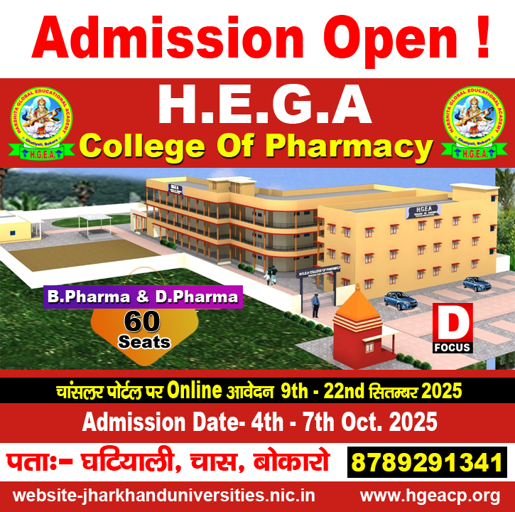 एच ई जी ए कॉलेज ऑफ़ फार्मेसी घटियाली चास बोकारो में एडमिशन पाने का बड़ा मौका बिनोद बिहारी महतो कोयलांचल विश्वविद्यालय ने बी फार्मा में नामांकन हेतु एडमिशन शेड्यूल जारी कर दिया है एच ई जी ए कॉलेज आफ फार्मेसी बोकारो में बी फार्मा और डी फार्मा की 60 सीट हैं जिसके लिए यूनिवर्सिटी के चांसलर पोर्टल से ऑनलाइन आवेदन 9 सितंबर से 22 सितंबर 2025 तक किया जा सकता है पहली चयन सूची 24 सितंबर 2025 को जारी की जाएगी चयनित विद्यार्थी 4 अक्टूबर से लेकर 7 अक्टूबर तक नामांकन कर पाएंगे दूसरी चयन सूची 9 अक्टूबर को जारी होगी किसी भी प्रकार की विशेष जानकारी के लिए आप कॉलेज प्रबंधन से संपर्क कर सकते हैं संपर्क नंबर-8789291341…