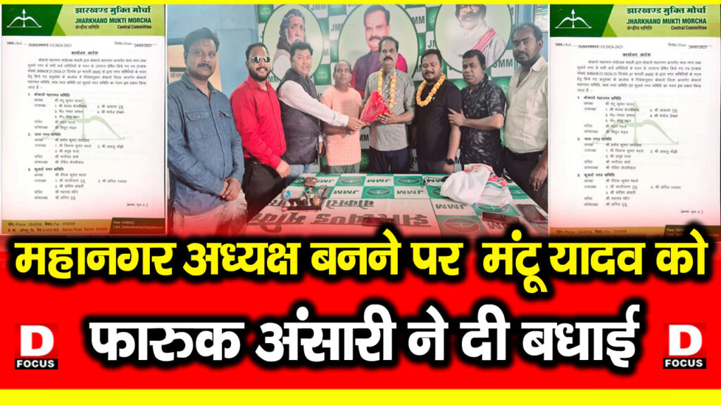 झारखंड मुक्ति मोर्चा नेता फारूक अंसारी ने बोकारो महानगर अध्यक्ष बनने पर मंटू यादव को दी बधाई फारूक अंसारी ने पार्टी के समर्थकों के साथ मंटू यादव से मिलकर उन्हें गुलदस्ता देकर बधाई दी झारखंड मुक्ति मोर्चा ने एक बार फिर पार्टी के वरीय नेता मंटू यादव को बड़ी जिम्मेदारी देते हुए बोकारो महानगर समिति का अध्यक्ष बनाया है समिति का अध्यक्ष बनाए जाने के बाद से ही बधाई का सिलसिला प्रारंभ हो गया है और इसी क्रम में पार्टी नेता फारुख अंसारी पार्टी सहयोगी समर्थकों के साथ मंटू यादव को बधाई देने पहुंचे…