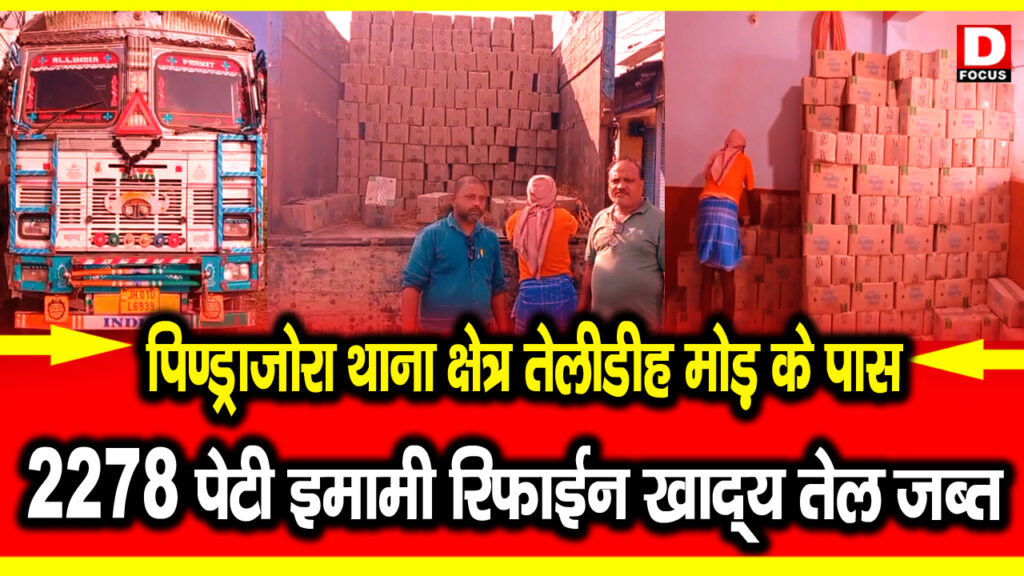 पिंडराजोड़ा थाना तेलीडीह मोड़ के बगल स्थित राजेश कुमार के मकान से पुलिस ने लगभग 40 लाख रुपए के 2278 पेटी इमामी रिफाइन खाद्य तेल को जब्त किया है।