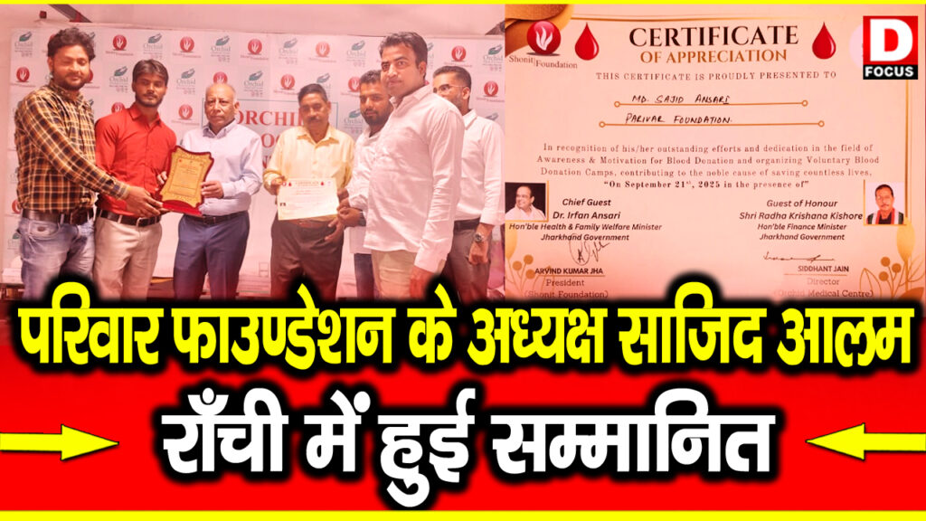 रांची: बोकारो के युवा समाजसेवी और परिवार फाउंडेशन के अध्यक्ष, साजिद आलम को रांची में सम्मानित किया गया। यह सम्मान उन्हें ऑर्किड ब्लड सेंटर, जिसका प्रबंधन शोनित फाउंडेशन द्वारा किया जाता है, की ओर से प्रदान किया गया।