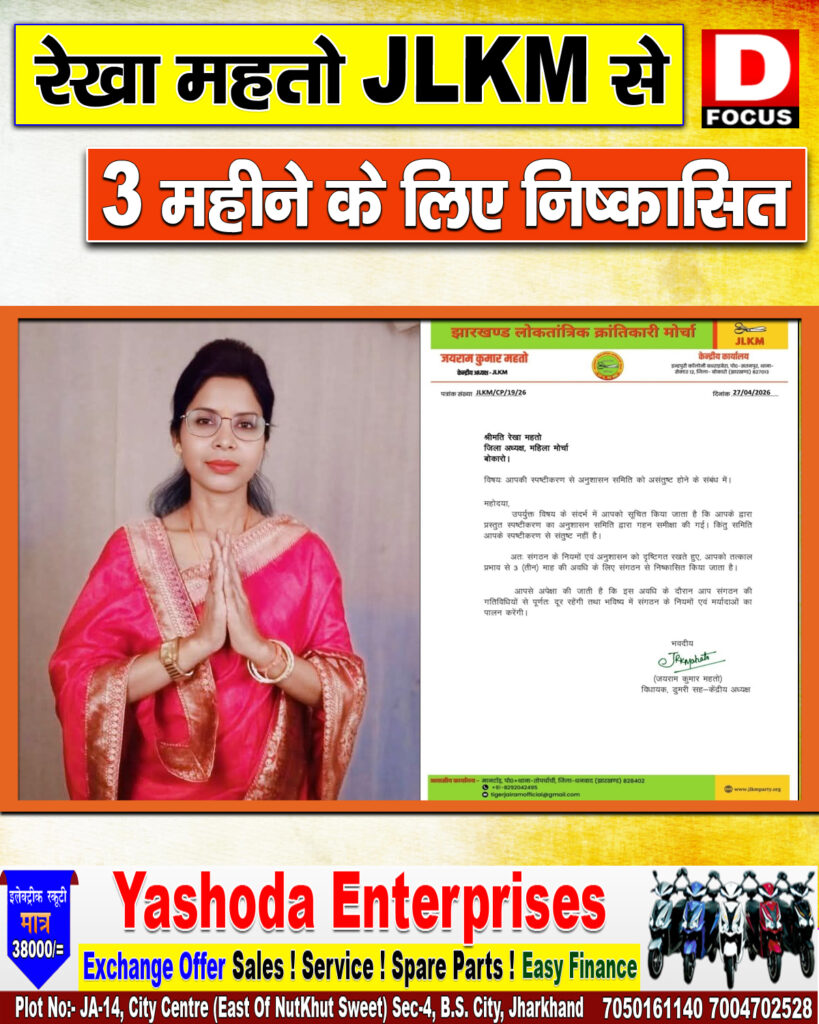 रेखा महतो झारखंड लोकतांत्रिक क्रांतिकारी मोर्चा से 3 महीने के लिए निष्कासित झारखंड लोकतांत्रिक क्रांतिकारी मोर्चा बोकारो जिला महिला मोर्चा की अध्यक्ष रेखा महतो को पार्टी ने 3 महीने के लिए संगठन से निष्कासित कर दिया रेखा महतो के स्पष्टीकरण से अनुशासन समिति संतुष्ट नहीं हुई और उसके बाद संगठन के नियम एवं अनुशासन को ध्यान में रखते हुए उन्हें निष्कासित कर दिया गया आपको बताते चले की रेखा महतो पर पैसे लिए जाने का गंभीर आरोप लगा था इसके बाद बोकारो जिले में झारखंड लोकतांत्रिक क्रांतिकारी मोर्चा सवालों के घेरे में आ गई थी….