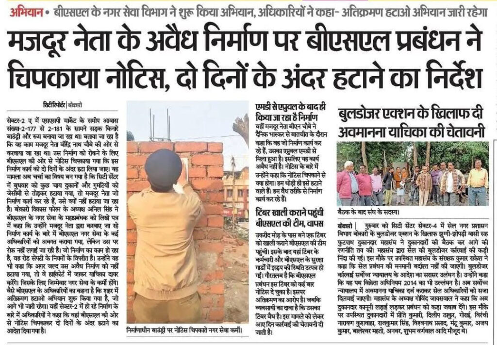 मजदूर नेता के अवैध निर्माण पर बीएसएल का नोटिस दो दिनों के अंदर अवैध निर्माण हटाने का निर्देश..