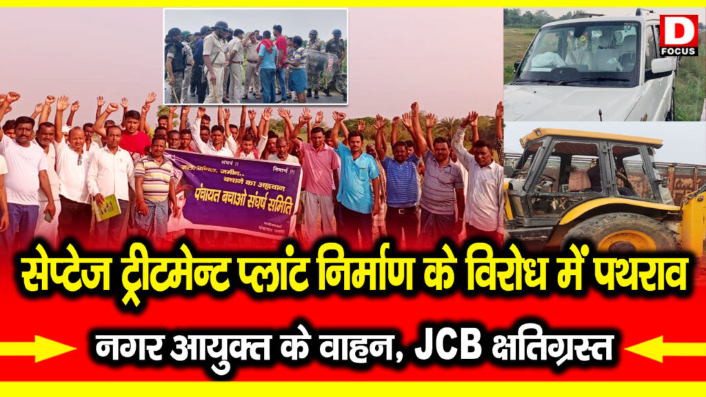 सेप्टेज ट्रीटमेंट प्लांट के निर्माण के विरोध में पत्थरबाजी नगर आयुक्त का वाहन और जेसीबी का शीशा टूटा